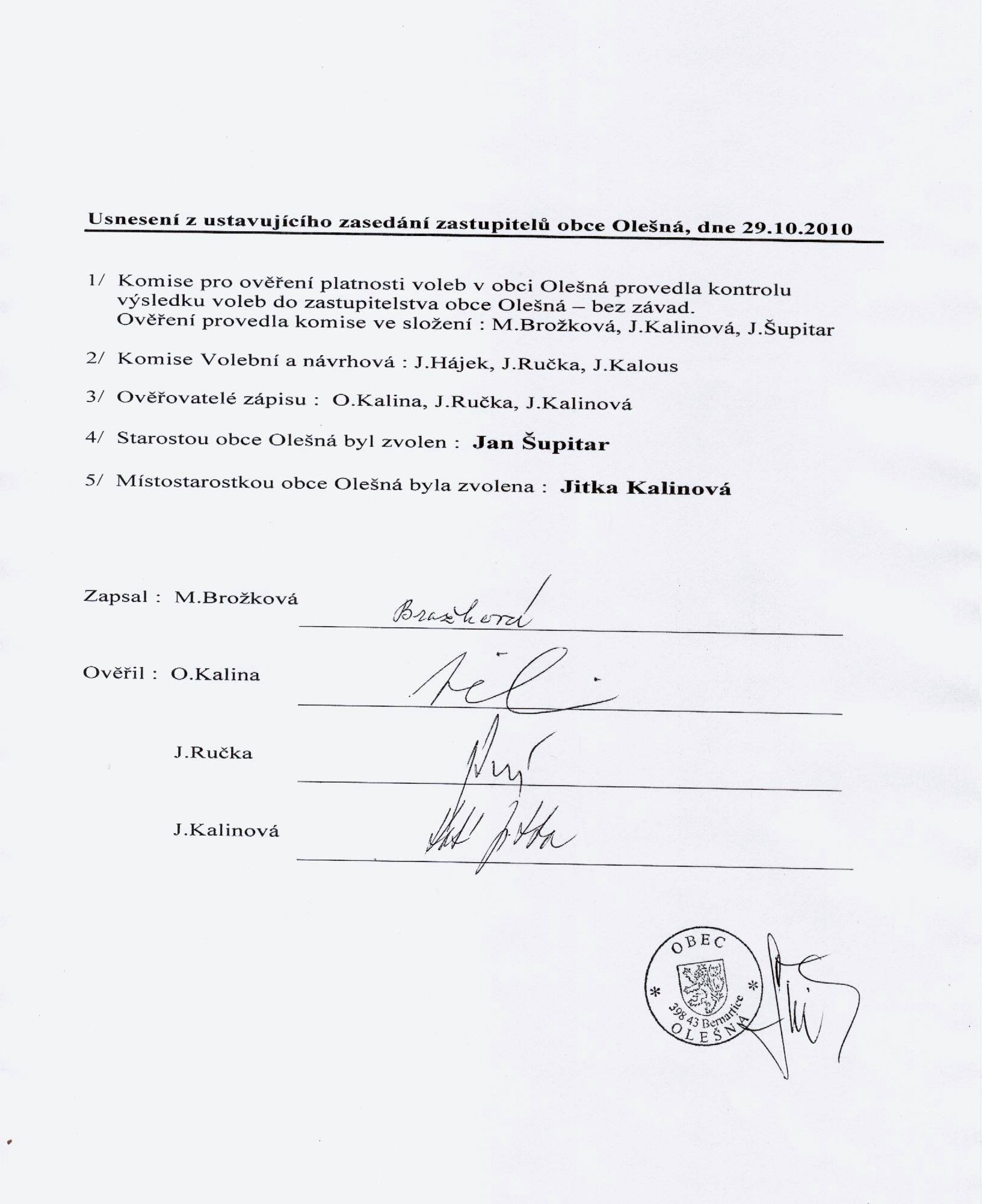Usnesení z ustavujícího zasedání zastupitelstva dne 29.10.2010